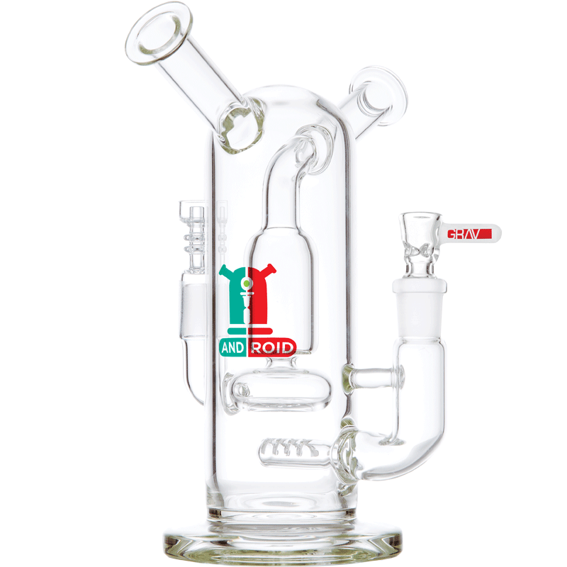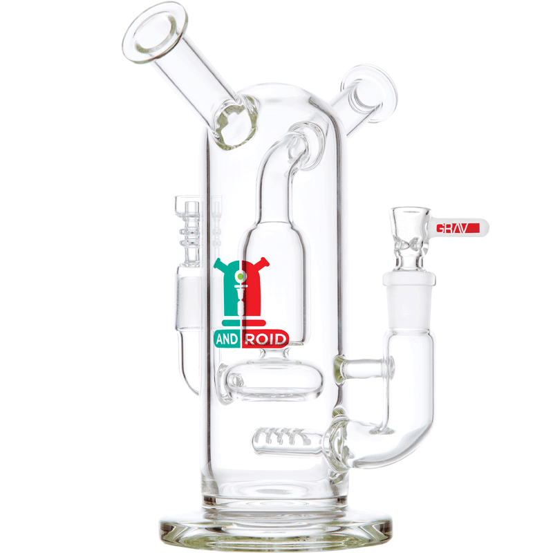 This super-unique 8" Grav Labs Android Flare Stemless Water Pipe is a dual purpose powerhouse. The Android has two personalities, this is really two water pipes in one. The concentrate side was designed with a 14mm quartz nail, the other side is for flower. With two separate chamber and two mouthpeices, two people can rip the Android at the same time!